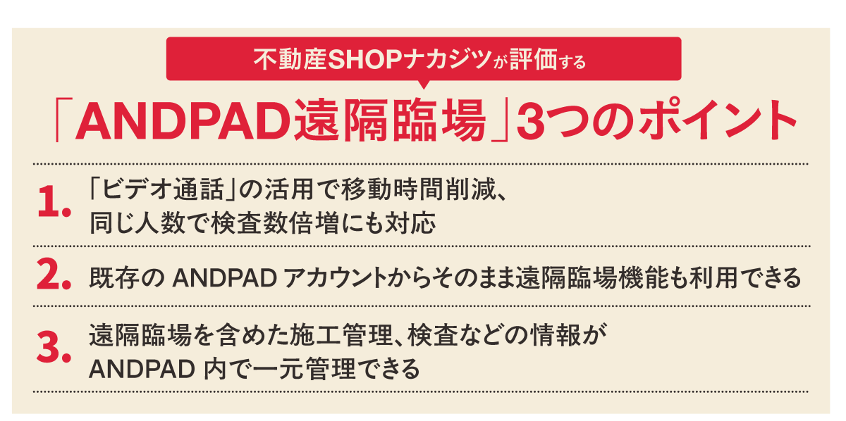 不動産SHOPナカジツでは従来から「ANDPAD」を導入しており、現場の関係者が同じ情報をリアルタイムで共有できる体制を構築していた。これが「ANDPAD遠隔臨場」のスムーズな導入につながったという。