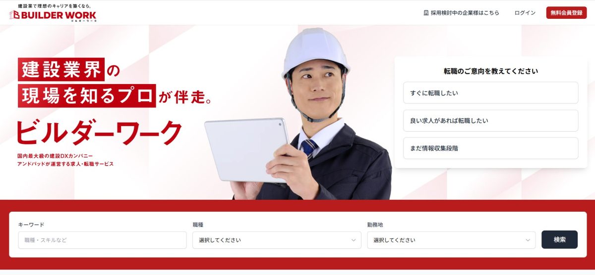 クラウド型建設プロジェクト管理サービス「ANDPAD」を運営する株式会社アンドパッド(本社:東京都千代田区、代表取締役:稲田武夫、以下アンドパッド)は、建設業界が抱える深刻な人手不足という課題を解決するため、業界特化型求人・転職サービス「ビルダーワーク(Builder Work)」の提供を開始いたします。