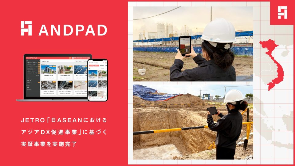 クラウド型建設プロジェクト管理サービス「ANDPAD」を運営する株式会社アンドパッド(本社:東京都港区、代表取締役:稲田武夫、以下アンドパッド)とベトナム現地法人 ANDPAD VIETNAM COMPANY LIMITED は、独立行政法人日本貿易振興機構(以下、JETRO)が事業実施事務局を担う「日ASEANにおけるアジアDX促進事業」において採択された「ベトナムの建設産業における業務効率化を目的とした建設プロジェクト管理サービスの開発・導入実証事業」が完了したことをお知らせいたします。