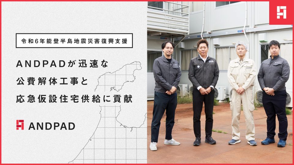 クラウド型建設プロジェクト管理サービス「ANDPAD」を運営する株式会社アンドパッド(本社:東京都港区、代表取締役:稲田武夫、以下アンドパッド)は、令和6年能登半島地震における復興支援を目的に、穴水地区を中心に公費解体事業を行なう株式会社宗重商店(本社:石川県金沢市、代表取締役:宗守重泰、以下宗重商店)へのANDPADによる活動支援を行いました。合わせて、応急仮設住宅の供給を行う三協フロンテア株式会社(本社:千葉県柏市、代表取締役社長:長妻貴嗣、以下三協フロンテア)において、石川県内の応急仮設住宅建設でANDPADが活用されたことをお知らせします。