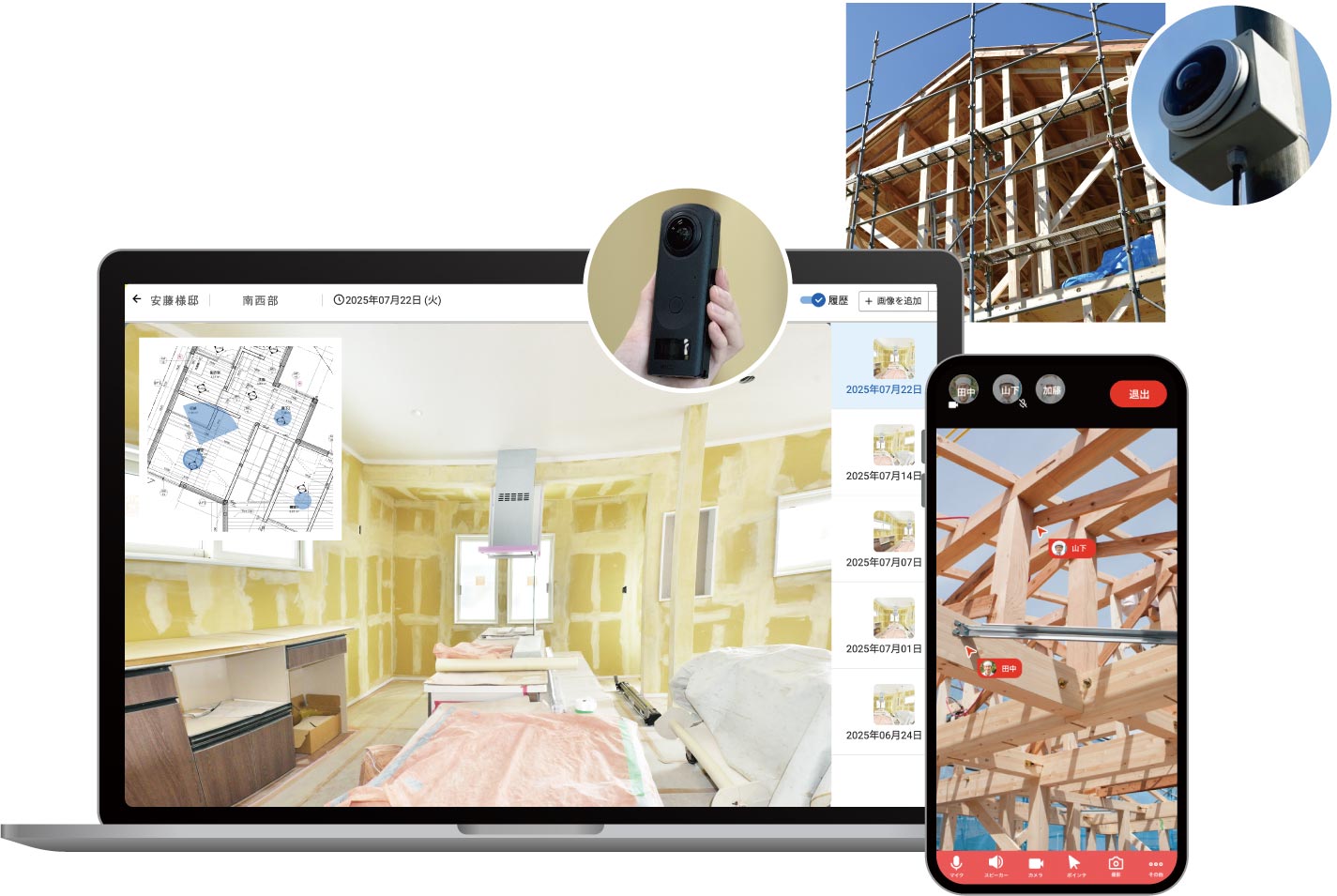FEATURE 現場カメラ・ビデオ通話・360度画像などにより、現場の状況確認から指示出しまで完結。移動にかかる工数を削減し、監督1人あたりの生産性を最大化